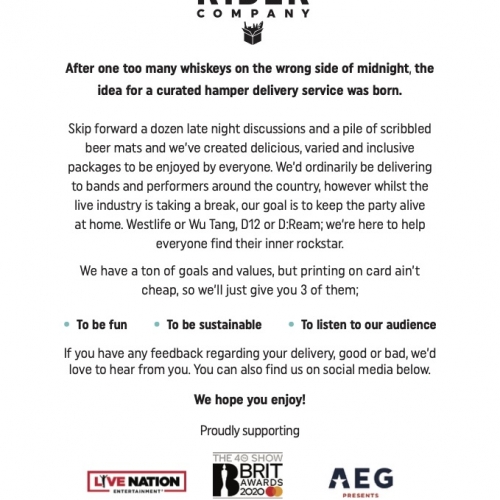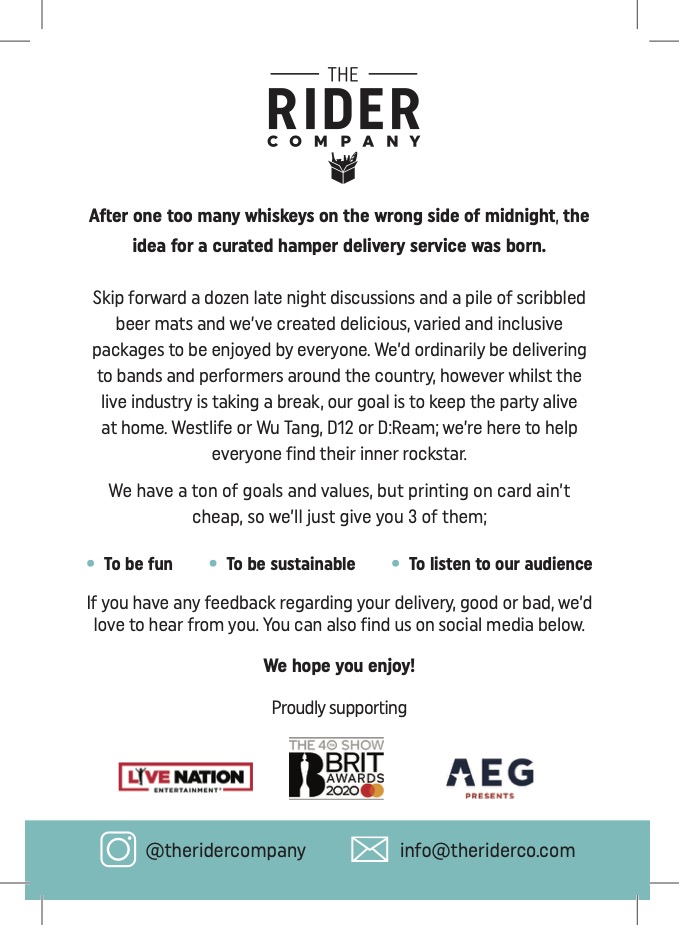 We’ve created delicious, varied and healthy snack packages ready to be enjoyed by just about anyone. We also provide snacks as backstage ‘riders’ at gigs, festivals and other live events. Our personalised snack boxes have been enjoyed at The BRIT Awards by Bastille, Yungblud, Declan McKenna, Louis Tomlinson, Bombay Bicycle Club, Sigrid, Gang of Youths, Tom Walker, Nothing but Thieves, Tom Grennan and Jack Savoretti.