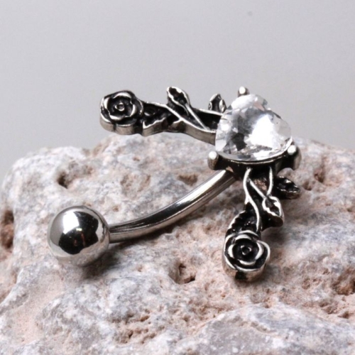 • Belly Button Rings / Navel Rings with Heart & Roses Design• Top down style navel ring• Antique plated jewelry• Single heart shaped Clear CZ in the center• Long stem rose on each side• Bar Thickness : 14GA / 1.6mm• Bar Length : 3/8″ / 10mm• Total Jewelry Size : 20.5 x 21mm• Ball Size : 5mm• Threading Type : Externally Threaded• Material : 316L Stainless Steel, Zinc Alloy, Cubic Zirconia
