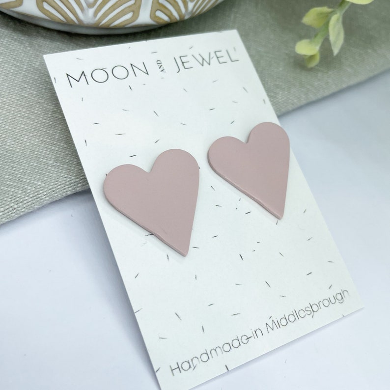 Large, dusty pink heart stud earrings with a stainless steel post and rubber back. Perfect valentine’s or galentine’s gift.