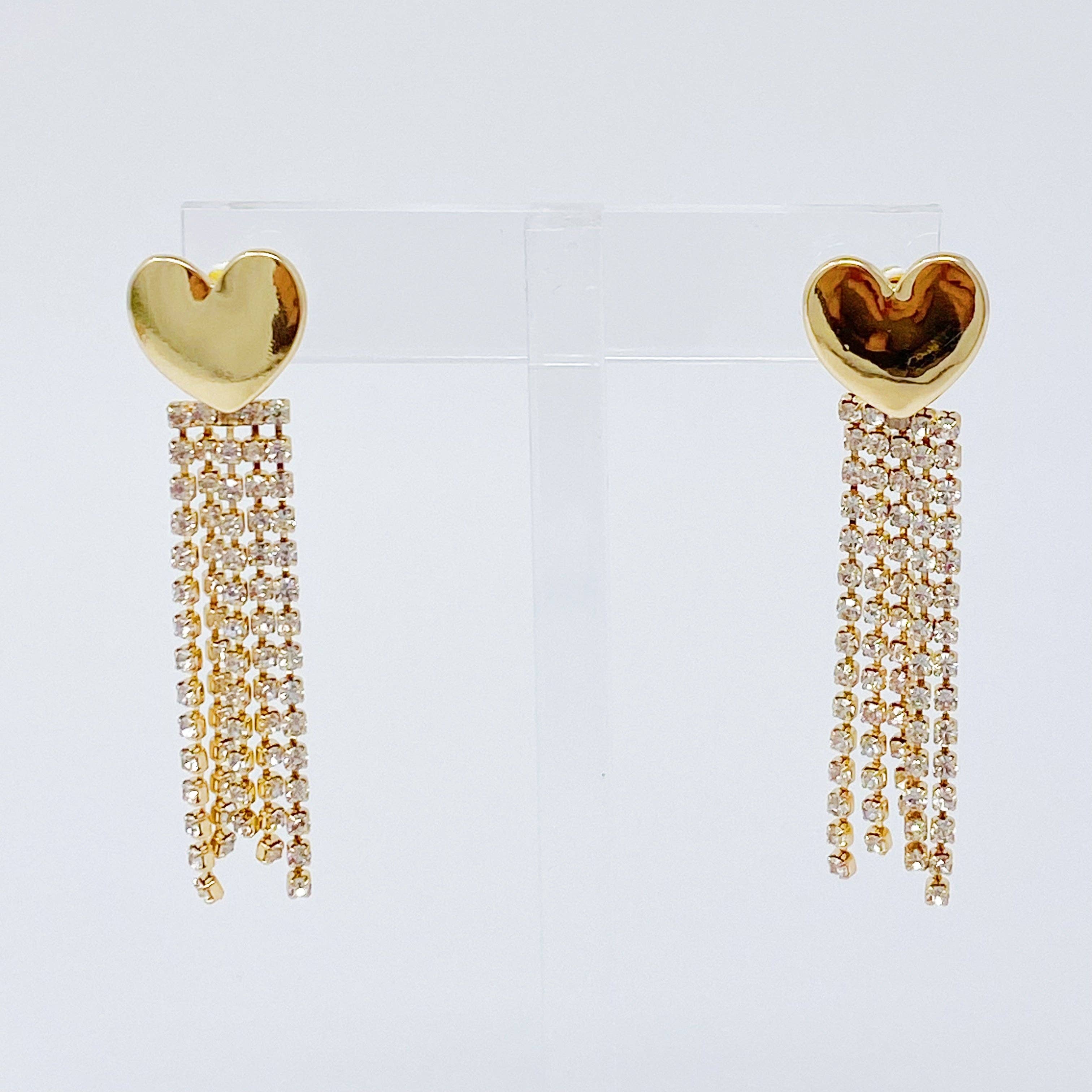 Polished golden heart with Cubic Zirconia chain strands drop make beautiful harmony! Dimensions: 2.2” drop, perfect for everyday and any occasions! Gold plated Brass Lead and Nickel compliant Made in China