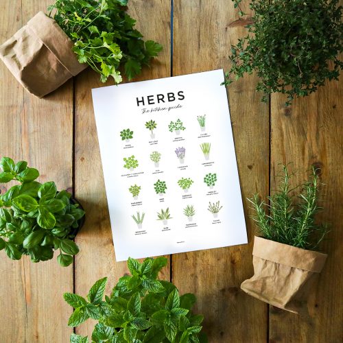 A minimalist herbs art print featuring popular culinary herbs that you can grow and cook with at home.