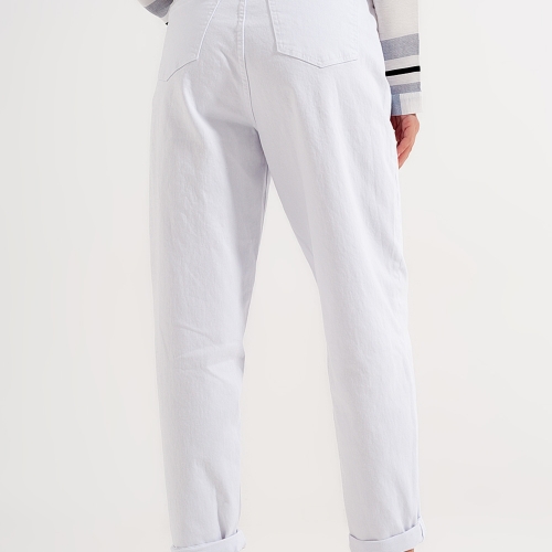 High waist loose tapered leg jeans with belt loops five pockets and a fly front zipper including a flap at the waistband in an elastic denim fabric