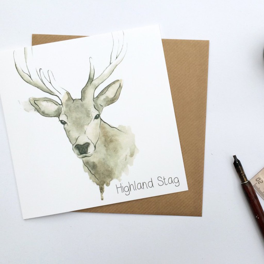 A contemporary watercolour illustration, featuring a wild highland stag
