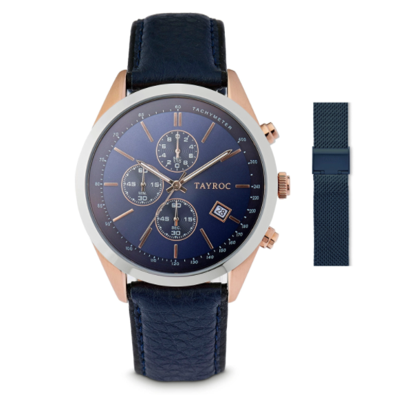Highlander by Tayroc, one of the trio of brand new styles. A bold and stunning composite of features pulled together to create a truly outstanding timepiece that is versatile and sleek. This piece comes in a blue and rose gold palette.