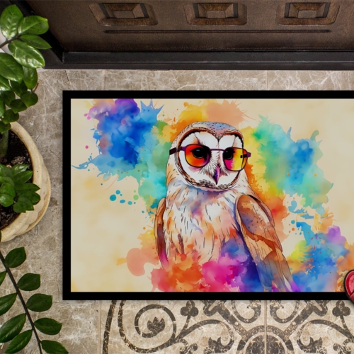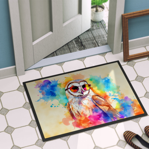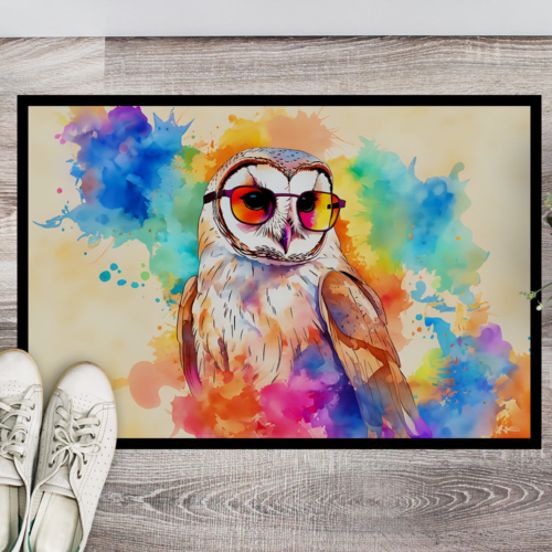Doormat featuring breed specific Barn Owl artwork. Welcome your guests in style with our Artwork Door Mat, designed to withstand almost any weather condition. This mat, measuring approximately 24 by 36 inches, is held together by durable black binding tape. Its top layer, composed of polyester felt, is dyed with the eye-catching image you see on the mat. A few layers below provide the mat with stability, while its rubber bottom is stamped to help prevent slipping and ensures safety. Our mat works wonderfully as both an indoor or outdoor door mat. For cleaning, simply hose it off with water or use a power washer – no need for any cleaner that produces suds. Avoid scrubbing with a brush, instead, opt for the vacuum on floor setting. Designed manufactured and printed in the USA, this mat is a perfect addition to your porch, outdoor kitchen, entryway, or any indoor space. Its unique design makes it a charming decorative rug that greets your guests and adds a stylish touch to your home decor.