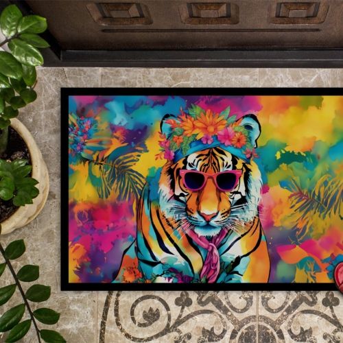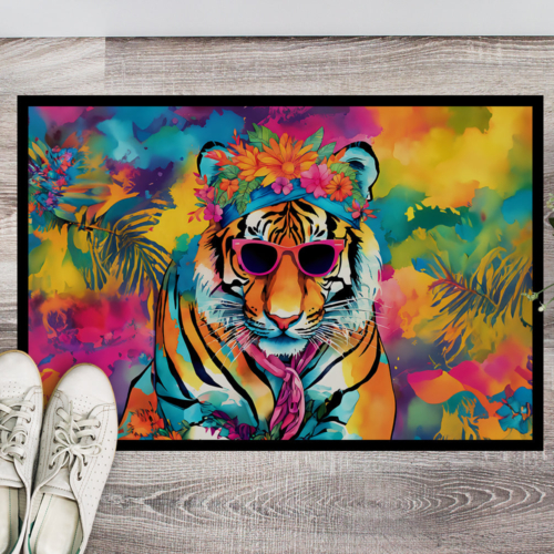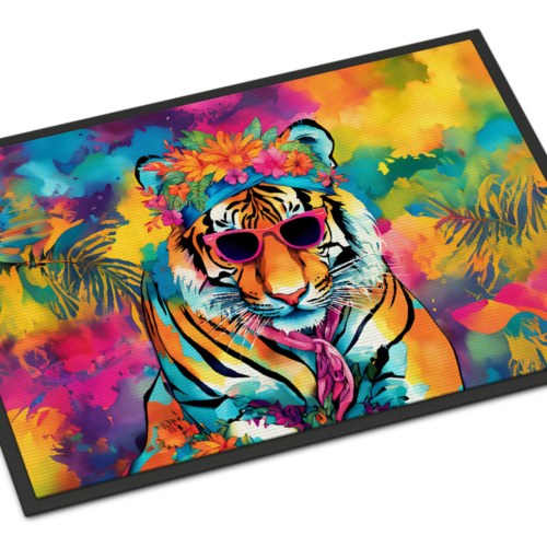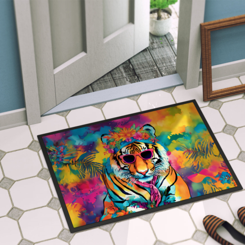 Doormat featuring breed specific Bengal Tiger artwork. Welcome your guests in style with our Artwork Door Mat, designed to withstand almost any weather condition. This mat, measuring approximately 18 by 27 inches, is held together by durable black binding tape. Its top layer, composed of polyester felt, is dyed with the eye-catching image you see on the mat. A few layers below provide the mat with stability, while its rubber bottom is stamped to help prevent slipping and ensures safety. Our mat works wonderfully as both an indoor or outdoor door mat. For cleaning, simply hose it off with water or use a power washer – no need for any cleaner that produces suds. Avoid scrubbing with a brush, instead, opt for the vacuum on floor setting. Designed manufactured and printed in the USA, this mat is a perfect addition to your porch, outdoor kitchen, entryway, or any indoor space. Its unique design makes it a charming decorative rug that greets your guests and adds a stylish touch to your home decor.