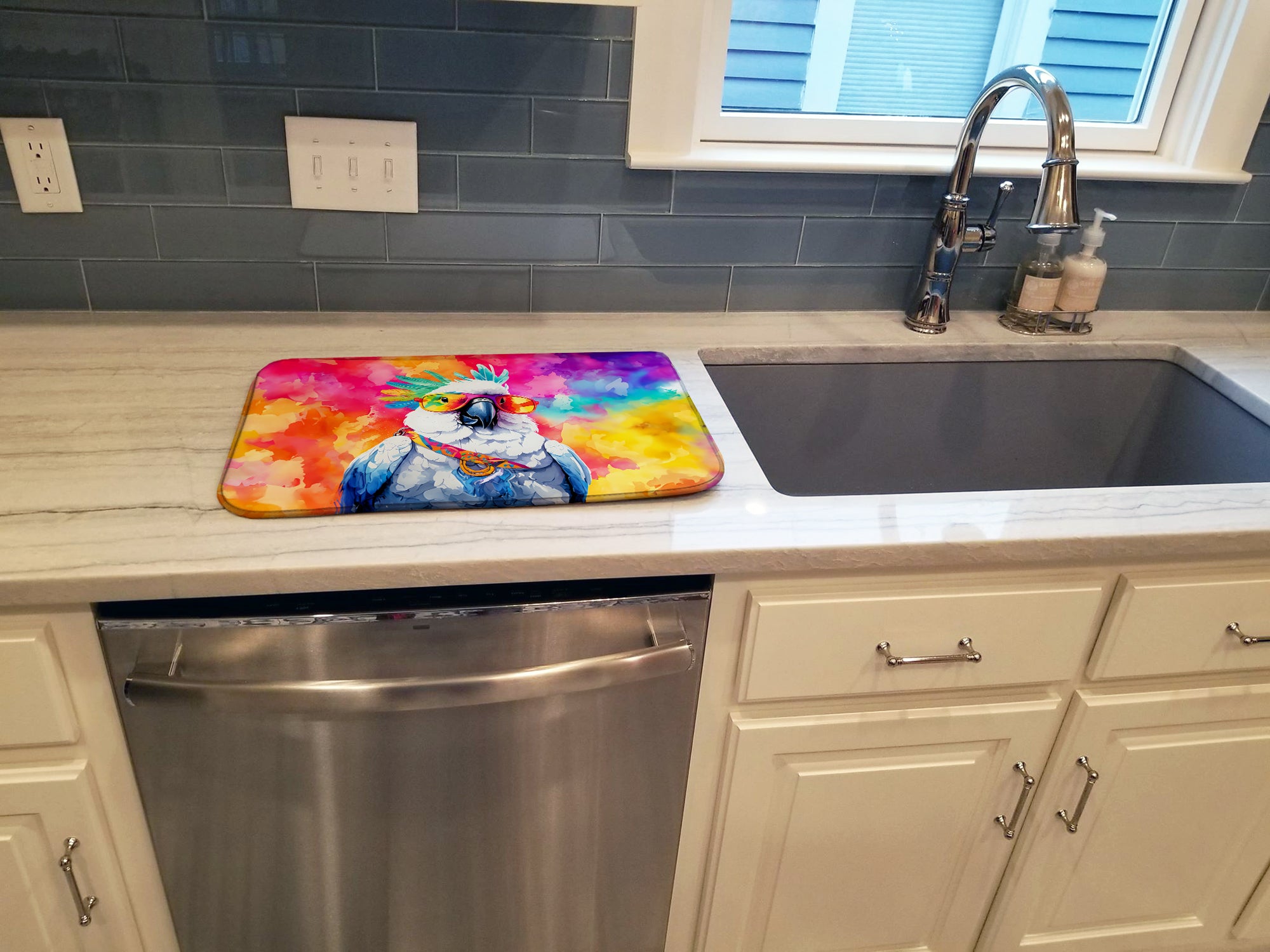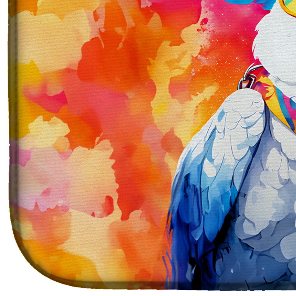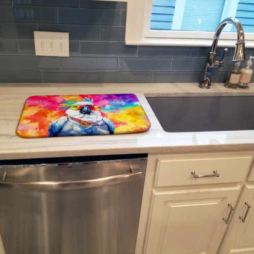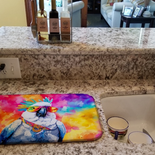 Dish Drying Mat featuring breed specific Cockatoo artwork. Say goodbye to messy countertops and soggy dish towels with our innovative dish drying mat. Our high-quality dish drying pad is designed to keep your countertops dry while offering a stylish and efficient solution. Whether you’re air drying dishes, glasses, stemware, silverware, pots, pans, bottles, or even fruits and vegetables, our dish mat is the perfect choice. The 14 inches x 22 inches size fits most counters and dish drying racks, and the non-slip design ensures stability. Made with water-absorbent polyester and a polyurethane foam insert, our dish drying mat is not only functional but also durable. It’s machine washable and printed in the USA for long-lasting use. The beautiful artwork adds flair to your kitchen decor, making it a perfect housewarming gift or present for any occasion. Upgrade your kitchen experience with our absorbent and versatile dish drying mat.