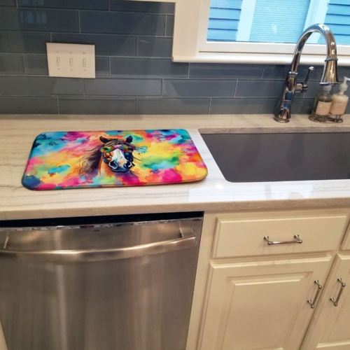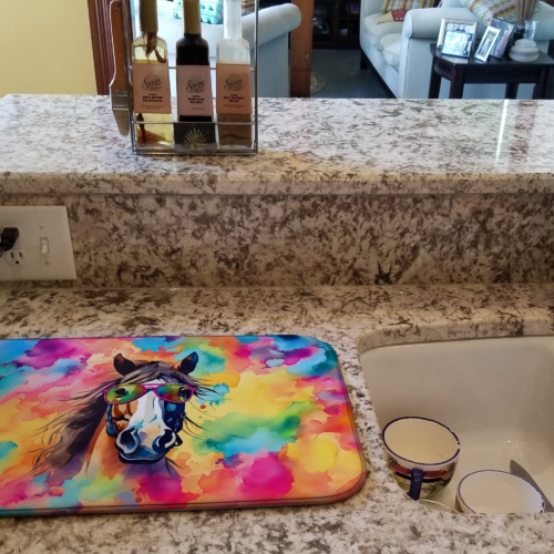 Dish Drying Mat featuring breed specific Horse artwork. Say goodbye to messy countertops and soggy dish towels with our innovative dish drying mat. Our high-quality dish drying pad is designed to keep your countertops dry while offering a stylish and efficient solution. Whether you’re air drying dishes, glasses, stemware, silverware, pots, pans, bottles, or even fruits and vegetables, our dish mat is the perfect choice. The 14 inches x 22 inches size fits most counters and dish drying racks, and the non-slip design ensures stability. Made with water-absorbent polyester and a polyurethane foam insert, our dish drying mat is not only functional but also durable. It’s machine washable and printed in the USA for long-lasting use. The beautiful artwork adds flair to your kitchen decor, making it a perfect housewarming gift or present for any occasion. Upgrade your kitchen experience with our absorbent and versatile dish drying mat.