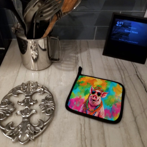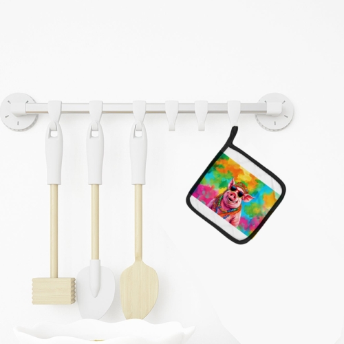 Pair of Pot Holders featuring breed specific Pig artwork. A Pair of Pot Holders to match your kitchen decor. Made in the USA these are thick and functional. Full color artwork decorates the front polyester fabric of the hot pad and accented by a black trim. Use these at as a trivet for your Thanksgiving or Christmas tablescape. Filled with insulated fabric and quilted for durability. These colorful pot holders will make a great gift for your favorite home cook or executive chef. Each pot holder measures approximately 7 1/2 inches by 7 1/2 inches. A hanging tab is included.