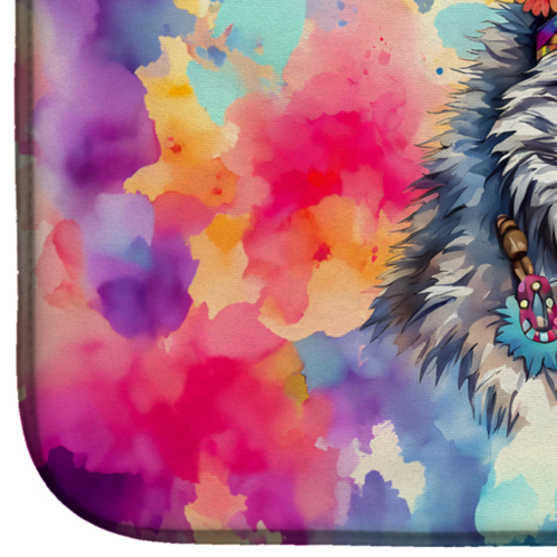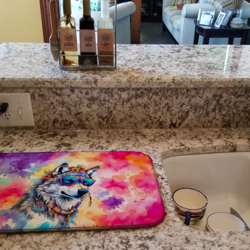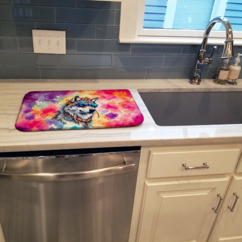 Dish Drying Mat featuring breed specific Wolf artwork. Say goodbye to messy countertops and soggy dish towels with our innovative dish drying mat. Our high-quality dish drying pad is designed to keep your countertops dry while offering a stylish and efficient solution. Whether you’re air drying dishes, glasses, stemware, silverware, pots, pans, bottles, or even fruits and vegetables, our dish mat is the perfect choice. The 14 inches x 22 inches size fits most counters and dish drying racks, and the non-slip design ensures stability. Made with water-absorbent polyester and a polyurethane foam insert, our dish drying mat is not only functional but also durable. It’s machine washable and printed in the USA for long-lasting use. The beautiful artwork adds flair to your kitchen decor, making it a perfect housewarming gift or present for any occasion. Upgrade your kitchen experience with our absorbent and versatile dish drying mat.