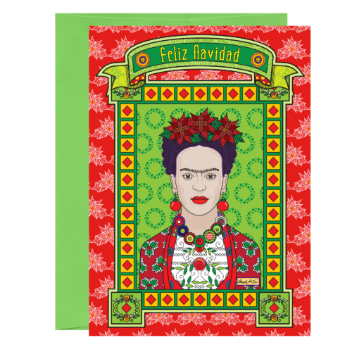 “Frida’s Christmas” Mexican artist Frida Kahlo’s 5×7 blank greeting card celebrates Christmas. In the colors of Christmas, red and green, she wishes you “Feliz Navidad”…Merry Christmas. Her life was as colorful as her art. A horrific bus accident as a young woman put her in chronic pain. Her tumultuous marriage to controversial Mexican artist, Diego Rivera, added to the intrigue of her story. This image frames Frida with a Mexican tile look. She poses with her legendary flowers in her hair, colorful jewelry, shawl, earrings, and unibrow.