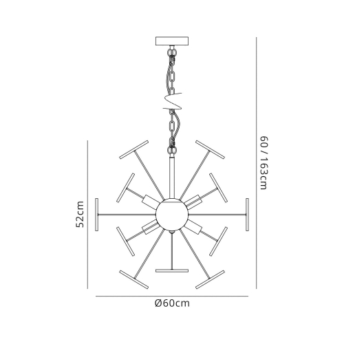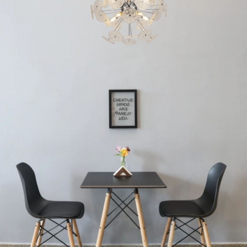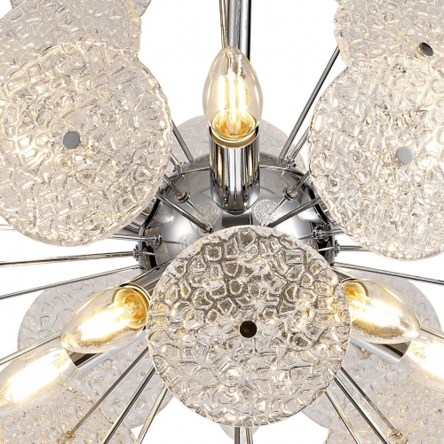 Drawing inspiration from a dandelion, this stylish pendant introduces a uniquely creative structure. A spherical central frame hosts a myriad of polished chrome rods at different lengths with glass discs, producing depth and dimension. The intricate pattern of the handmade glass adds further character to this stylish lighting solution.