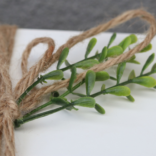 Featured black printed warm sentiment that reads “”home sweet home”” on front, PVC green leaves on top and decorated with jute string.