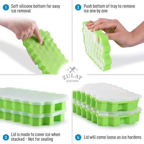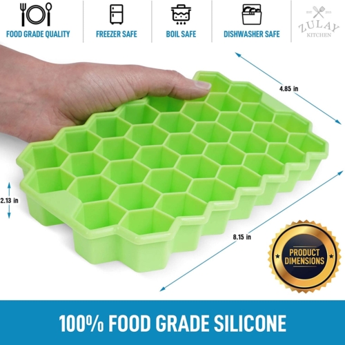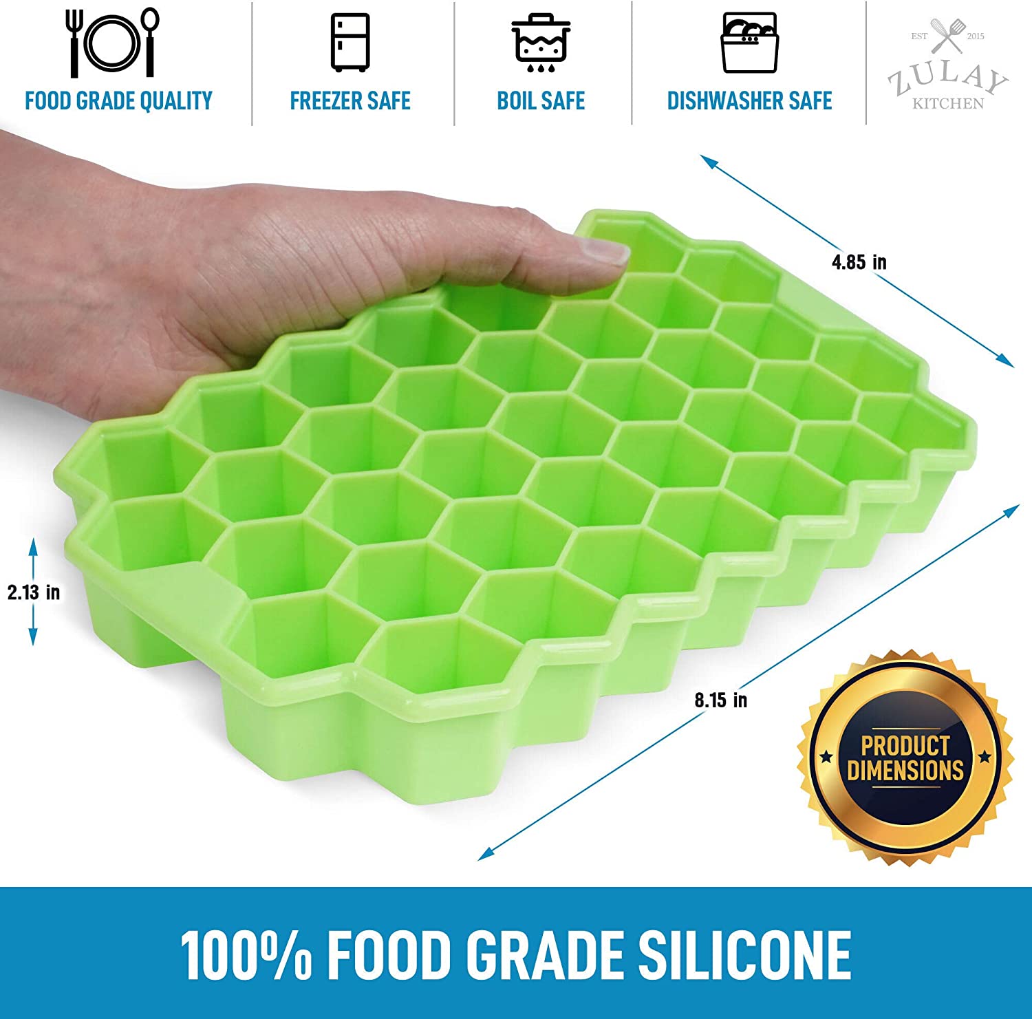 QUICK & EASY HONEYCOMB SHAPED ICE Cracking a standard ice cube tray can prove to be difficult in the long run, especially when it can only make a small amount of ice at a time. With the Zulay Kitchen Honeycomb Ice Tray, you can now create 37 hexagon shaped cubes in one go! Made with BPA Free 100% silicone that is soft and bendable for easy removal. Each cube has a diameter of a quarter designed to perfectly fit into any water bottle. Package includes 2 trays and 2 lids.