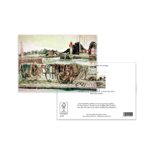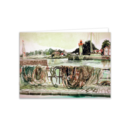 A French harbour scene from Honfleur, featuring fishing nets, boats, and lighthouse, painted in watercolours. A maritime design perfect for collectors of travel, harbour, and coastal art.