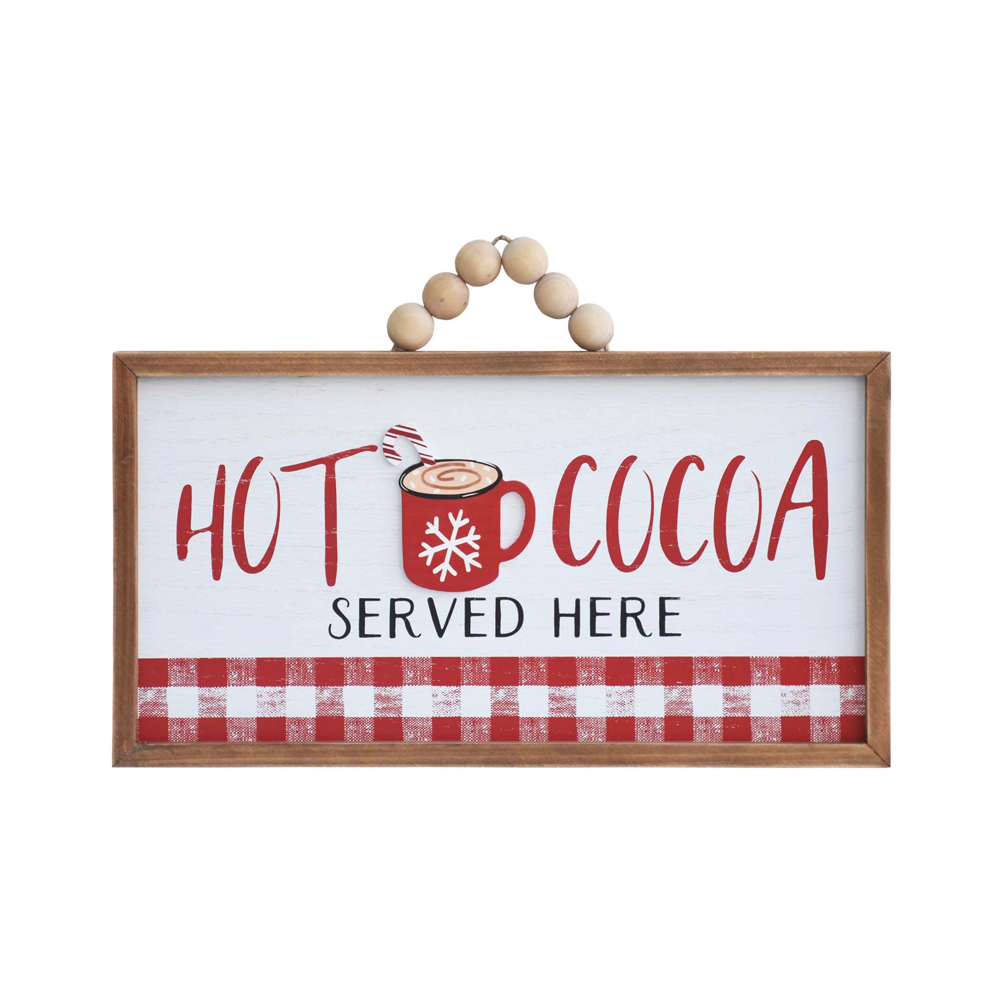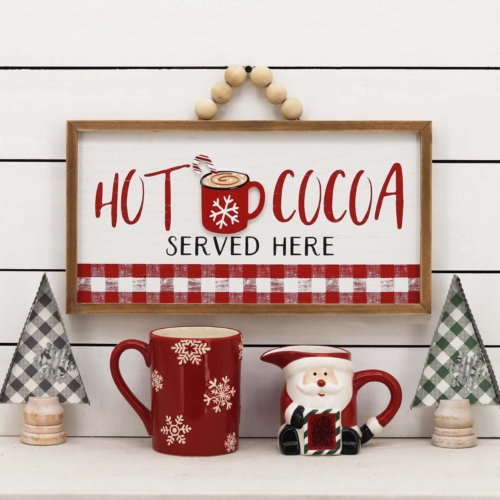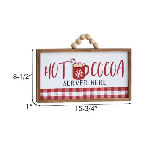 It measures 15.75″”W x 8.5″”H, which is a great size to accent a shelf, mantel, or table. The framed wood sign reads “”hot cocoa served here”” with the mug of cocoa cut out and layered on top to add detail.