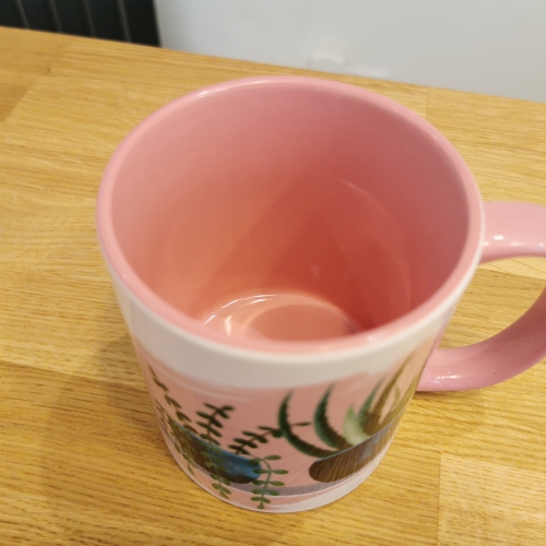This pink colour accent mug has pink handle and pink inner. It measures 9.8 cm tall. A great size tea, coffee or hot choccy mug.