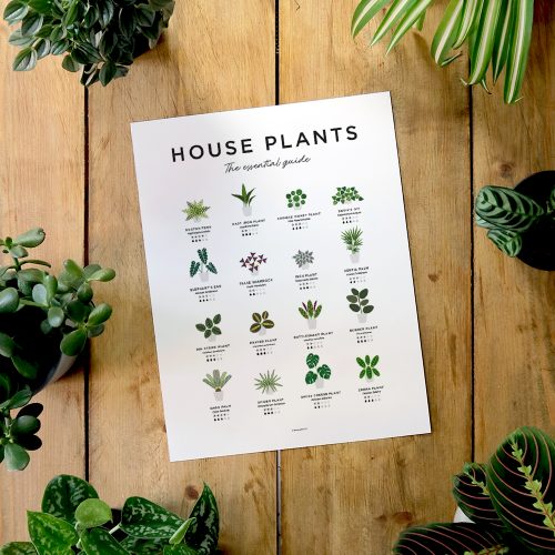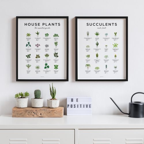 A minimalist house plants art print featuring popular indoor plants from around the world, along with the each plants care guide represented by light and water infographics.