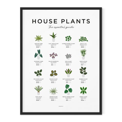 A minimalist house plants art print featuring popular indoor plants from around the world, along with the each plants care guide represented by light and water infographics.