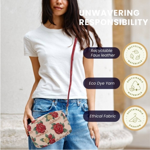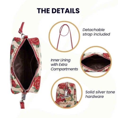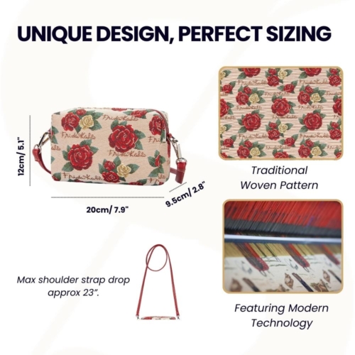 FABRIC COMPOSITION: 100% Polyester.EASY CARE: Clean it with a damp cloth. Do not soak in water.Enjoy your day with a unique branded medium shoulder bag by Signare.[custom_html]UNIQUE LIFESTYLE DESIGN: FRIDA KAHLO DE RIVERA (1907-1954) was a Mexican artist who painted many portraits, self-portraits, and works inspired by the nature and artefacts of Mexico. She employed a naïve folk-art style to explore questions of identity, post-colonialism, gender, class, and race in Mexican society. Frida is celebrated in around the world for her depiction of the female experience and form as well as her love of nature.In collaboration with the Frida Kahlo Corporation, we have created a licensed range of products with our own unique Frida Kahlo design. Featuring Frida Kahlo logo and rose design, perfect for her fans!PRODUCT DESCRIPTION: The tapestry hip bag with shoulder strap is a compact piece for carrying all the daily essentials for a day around the city. This model belongs to Signare’s shoulder bags for women series of products. Modest amount of space within for your phone, purse and personal goods. Nylon inside layer. Closed with a zip top. Detachable shoulder strap included. Made from Signare tapestry woven fabrics. Removeable shoulder drop: 24″ 1x inner sleeve pocket Patterned nylon lining inside Design may vary due to productions methods DIMENSIONS:Product size: 8 x 7 x 3 inch — Package size: 8.5 x 7.5 x 3.5 inchWEIGHT: 0.5 lbs See All Hip Bag Designs See All Styles/Models in Frida Kahlo Collection[/custom_html]