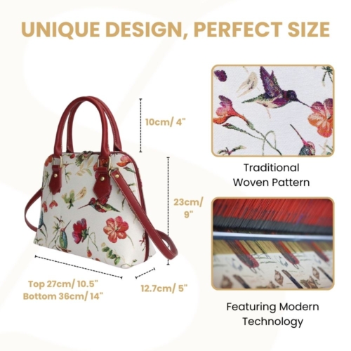 FABRIC COMPOSITION: 100% Polyester.EASY CARE: Clean it with a damp cloth. Do not soak in water.Express your individuality through Signare! [custom_html]UNIQUE LIFESTYLE DESIGN: The exotic and friendly hummingbird in flight adorns this pattern, swiftly floating from flower to flower to acquire its nectar. The collection of birds brings a radiant appeal to the tapestry material. PRODUCT DESCRIPTION: Proven to be one of our most popular tapestry bags with shoulder strap styles and one of the best shoulder bags for women. This elegantly designed classic top handled handbag is one that can serve as a fantastic choice for your everyday needs Brilliant choice for small travel, evening walks or overnight Features a modest area for storing your handbag essentials, with an open sleeve and zip up pocket also featured on the inside Fully lined with a patterned nylon Faux leather handle and detachable shoulder straps included Has the option to be worn as a handbag or converted into a cross body or shoulder style bag Fitted with a full length zip fastener Solid base with 4 studded feet Size: 12.5 x 9 x 5 inches – Weight: 1 lb See All Convertible/Top Handle Purse Bag Designs See All The Styles/Models in Hummingbird Collection [/custom_html]