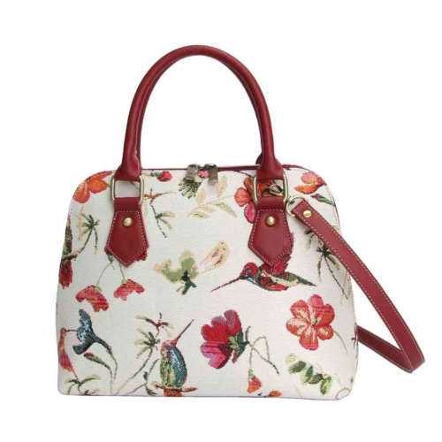 FABRIC COMPOSITION: 100% Polyester.EASY CARE: Clean it with a damp cloth. Do not soak in water.Express your individuality through Signare! [custom_html]UNIQUE LIFESTYLE DESIGN: The exotic and friendly hummingbird in flight adorns this pattern, swiftly floating from flower to flower to acquire its nectar. The collection of birds brings a radiant appeal to the tapestry material. PRODUCT DESCRIPTION: Proven to be one of our most popular tapestry bags with shoulder strap styles and one of the best shoulder bags for women. This elegantly designed classic top handled handbag is one that can serve as a fantastic choice for your everyday needs Brilliant choice for small travel, evening walks or overnight Features a modest area for storing your handbag essentials, with an open sleeve and zip up pocket also featured on the inside Fully lined with a patterned nylon Faux leather handle and detachable shoulder straps included Has the option to be worn as a handbag or converted into a cross body or shoulder style bag Fitted with a full length zip fastener Solid base with 4 studded feet Size: 12.5 x 9 x 5 inches – Weight: 1 lb See All Convertible/Top Handle Purse Bag Designs See All The Styles/Models in Hummingbird Collection [/custom_html]