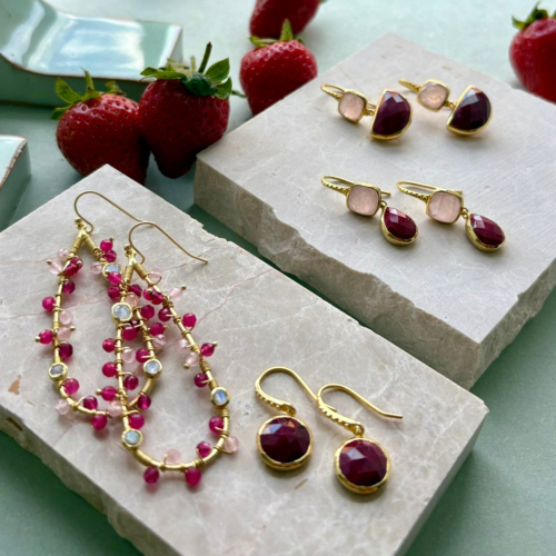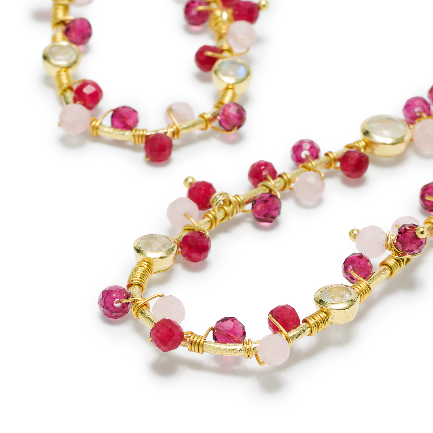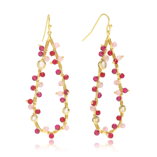 Artisan handcrafted Metal: 22 Karat Gold on recycled Brass Gemstone: Moonstone, Rose Quartz, Pink Jade and Pink Tourmaline Hydro Earring dimensions: 70 x 22mm All jewellery arrives in our luxury soft pouch and branded box Make a statement with these unique and cool Hydra Large Teardrop Wire-Wrapped Gemstone Earrings. Crafted with mixed pink gemstones.