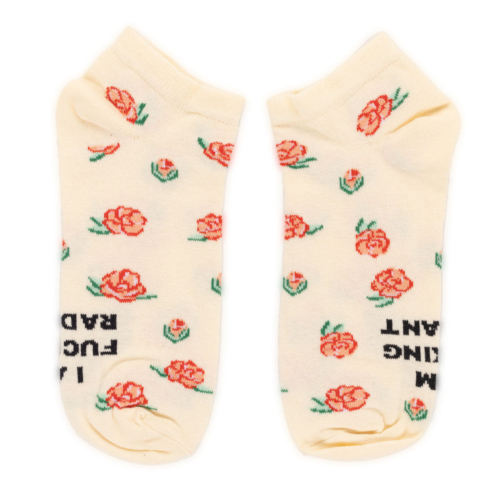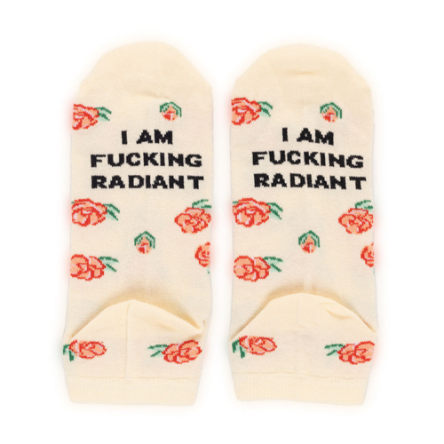 The cutest ankle socks we ever did see! Featuring a sweet floral print on the top, and a hidden message underneath, these socks will make a meaningful gift for anyone who needs a reminder that they’re f*cking radiant! Why you’ll love them One size, women’s fit low rise socks Every purchase helps a woman or girl in need Free UK & EU shipping on all orders over £70! Checkout with Shopify Payments and Paypal for 100% secure and safe transactions. We want you to love your items, so if anything you buy isn’t perfect, just let our friendly support team know over live chat and they’ll do everything in their power to fix the problem or give you a full refund. Product Specs: Includes one pairOne size (women’s fit)80% Cotton 15% Polyamide, 5% Elastan220mm long