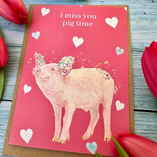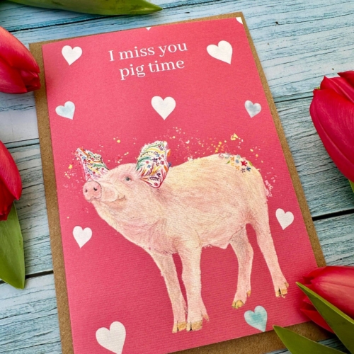 I miss you pig time | Eco Friendly Card Cute Colourful Farm | Eco Friendly Card Cute Colourful | Colourful | Birthday Blank | Friend | Blank | Funny | Occasion | Greetings | Pink hearts
