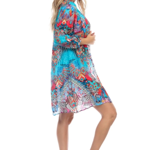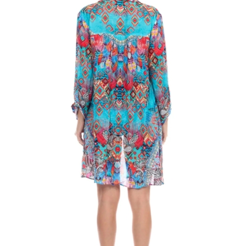 Easy Shirtdress Cover-Up The Short Effortless Shirtdress Cover-Up Ikat Blossom Easy Shirtdress Cover-Up With A Collar, Patch Pockets, And Button Front. This Ikat floral Cover-Up is a essential tunic perfect to wear over your swimsuit. This is the ultimate vacation tunic as it has so many end uses. Ths shirtdress coverup also has matching swimwear to make head turns on your next tropical vacation. Elevate your seashore style in this stunning top from our True Colors Beach collection 100% Modal Pack of 4 Pcs