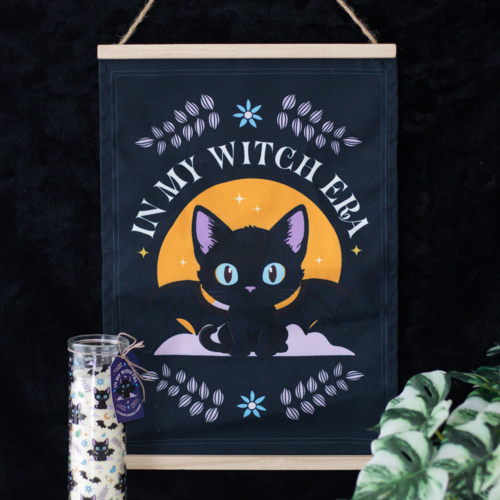 Bring magical vibes to any room with this fabric wall hanging showcasing the phrase ‘In My Witch Era’ alongside a charming bat-winged black cat. Ideal for those who love showing off their witchy side. Designed by Something Different Wholesale and part of the Cute & Creepy collection of mystical gifts and home décor.