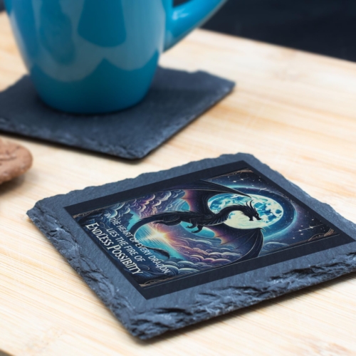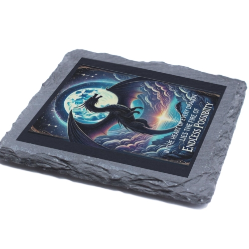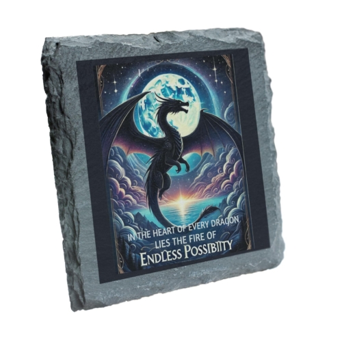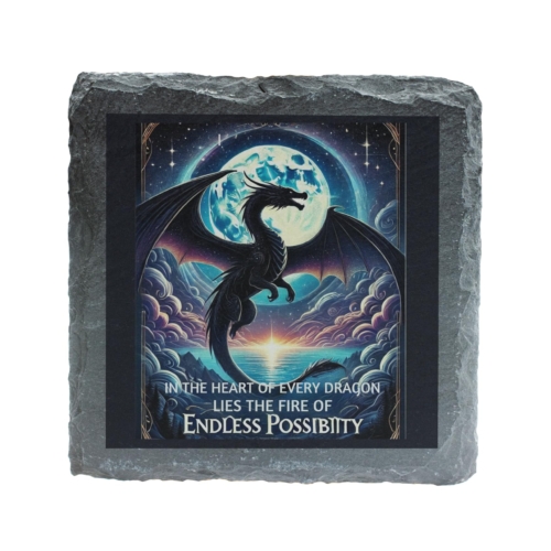 Unleash the magic and fire within with the “In the Heart of Every Dragon” Slate Coaster. This stunning piece features a breathtaking dragon soaring under a moonlit sky, accompanied by the inspiring quote: “In the heart of every dragon lies the fire of endless possibility.” Crafted from premium natural slate, this coaster seamlessly combines durability with artistry, making it both practical and decorative. Ideal for protecting your surfaces, it also serves as a reminder of resilience and limitless potential, perfect for dragon enthusiasts or anyone inspired by mythical worlds. Whether as a unique addition to your home or as a gift for someone special, this coaster is a true celebration of fantasy and motivation. Transform your space with a touch of magical elegance today! Enchanting Dragon Design: Features a majestic dragon under a moonlit sky with the empowering quote: “In the heart of every dragon lies the fire of endless possibility.” Premium Slate Quality: Made from durable, natural slate for a refined, rustic touch to your decor. Motivational and Artistic: A unique piece combining inspiration with stunning fantasy-themed artistry. Perfect for All Surfaces: Protects your tables while adding a touch of mythical elegance. Ideal Gift for Dragon Lovers: A thoughtful present for fans of dragons, fantasy art, and motivational quotes.