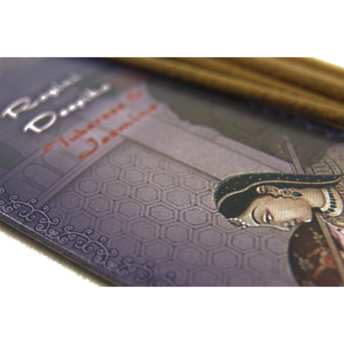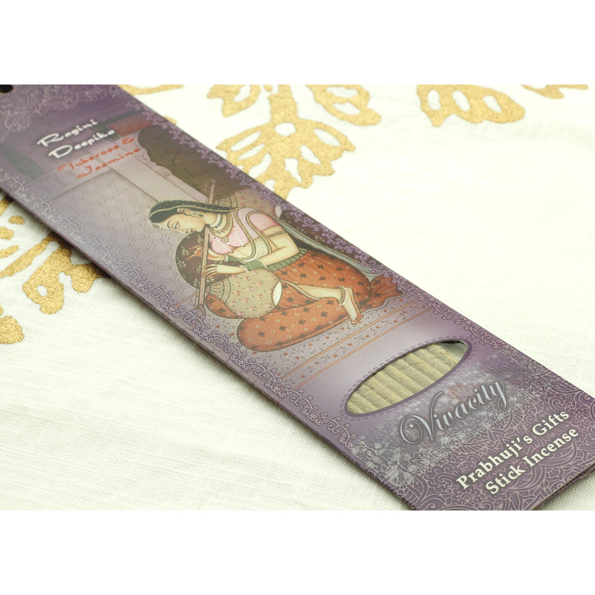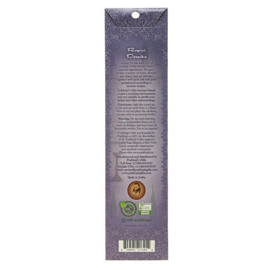 Evoking the air of love on a summer’s night, notes of the white perennial tuberose will be released into your space as carnal, creamy and velvety nuances. Blended perfectly with jasmine’s floral scent, its sweetness wraps like a vine through this rich floral fragrance. This fragrance carries a melodic vibration fit for royal lovers, and is ideally burned and enjoyed after sunset. A ragini is a female raga, an ancient melodic form of Indian classical music played in a certain scale of notes with its own melodic form and associated mood. The raga-ragini combination evolved from the spiritual practice of Tantra around the 14th century, reflecting the male and female energies. Together the static and dynamic energies create mood-evoking music. Aroma: This scent features Tuberose and Jasmine Intention: Vivacity. Key features: Handmade by artisans in India’s cottage industry Fragrant aromatherapy Mood uplifting Green: Prabhuji’s Gifts is a Green America Gold Certified business, packages its stick incense in 100% recycled cardboard, and uses recycled and reused packaging products for shipping materials. Charitable cause Attributes This exotic stick incense is hand-rolled by artisans in India’s cottage industry and blended in accordance with ancient traditional wisdom, designed to create an irresistibly amorous mood with its fragrant notes of two night-blooming flowers. Name explanation: Ragini Deepika is a Vedic melody personified by a woman who is often depicted playing the ancient Vedic string instrument known as a vina. Why customers love it: Herbs, flowers and resins are blended together with pure oils and pure sandalwood, combined in accordance with ancient traditional wisdom. This line of incense is designed as a fragrant offering to a higher power, a spiritual practice that deepens one’s devotion while reveling in its enchanting fragrance. Collection: Harmony Incense Sticks Collection Description: This is one of 13 unique fragrances that bring romantic and mysterious moods, enticing vibrations and dynamic energy into one’s space. Each one of these fragrances is named after a Ragini, the feminine musical aspect that evolved from Tantra: the worship of the male and female cosmic energies. Raginis color the mind with their individual hues and notes, evoking memorable moods, carrying vibrations that can transform the feeling in the air to that of romance, love, longing, and even playfulness. Packaging: Colorful packaging made from 100% recycled cardboard, artistically displaying traditional Indian artwork that portrays the personification of each specific Ragini. This incense is kept fresh in a plastic pouch and can be seen through an oval window. A hole in the top makes it ideal for displaying on a hanging rack. Manufacturing process: Natural ingredients are blended together into a paste and hand rolled onto a thin bamboo stick, according to ancient traditional wisdom, in a sustainable manner by artisans in India’s cottage country, providing employment to rural villagers. An auditor ensures there is no child labor. Certifications: Gold-level Green America Certified Business Better Business Bureau (BBB) Accredited Business: rating A+ Sustainability: Ingredients are harvested, blended and rolled by hand in the traditional Indian method, producing minimal waste and employing artisans in India’s rural cottage industry. This product’s package is made from 100% recycled paper, and shipping materials are made from recycled and reused packaging products. Sustainability: Ingredients are harvested, blended, and hand rolled in the traditional Indian method, producing minimal waste and employing artisans in India’s rural cottage industry. This product’s package is made from 100% recycled paper, and shipping materials are made from recycled and reused packaging products. Charitable Cause: Prabhuji’s Gifts supports Prabhuji Mission, a New York-based, nonprofit religious organization that is home to a spiritual community. Prabhuji mission runs humanitarian projects including: Prabhuji Food Rescue Program, in which the organization feeds people in need in the USA, Dominican Republic, Colombia and India. By purchasing Prabhuji’s Gifts products, you help support these causes. Ingredients Herbs, flowers and resins are blended together with pure oils and pure sandalwood, combined in accordance with ancient traditional wisdom and hand rolled onto a thin bamboo stick. How to use: Light the coated tip of the incense until it ignites. Blow it out and place the smoking incense stick in an incense holder. Specs SKU: 213-45 UPC: 8-09581-21345-4 Contains: 10 sticks LxWxH: 9.5”x2.5”x0.15″Weight: 0.8oz. Made in: India Return Policy: This product is fully refundable.