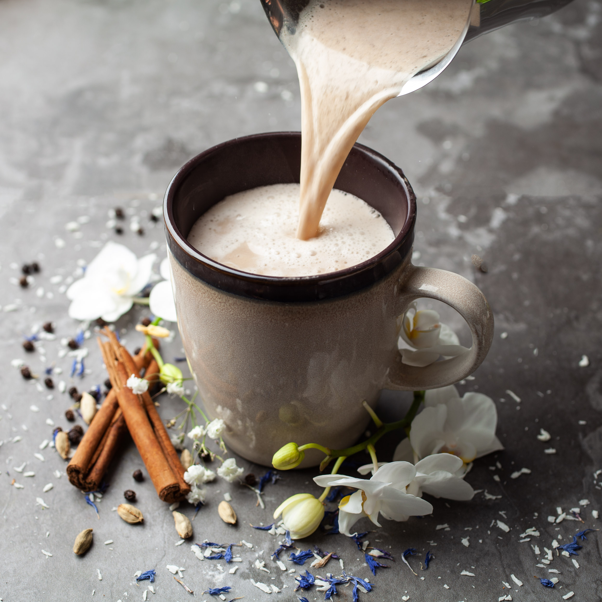 Organic and Vegan coconut milk powder, organic raw crystallised coconut nectar, organic Reishi mushroom powder, organic ground chai spice mix