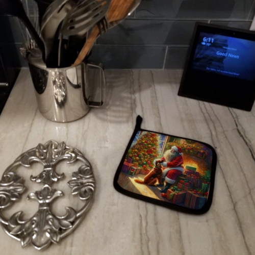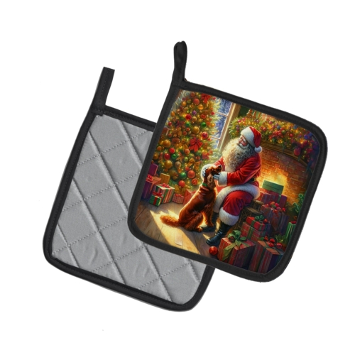 Pair of Pot Holders featuring breed specific Irish Setter artwork. Celebrate Christmas with this Christmas Pair of Pot Holders. A Pair of Pot Holders to match your kitchen decor. Made in the USA these are thick and functional. Full color artwork decorates the front polyester fabric of the hot pad and accented by a black trim. Use these at as a trivet for your Thanksgiving or Christmas tablescape. Filled with insulated fabric and quilted for durability. These colorful pot holders will make a great gift for your favorite home cook or executive chef. Each pot holder measures approximately 7 1/2 inches by 7 1/2 inches. A hanging tab is included.