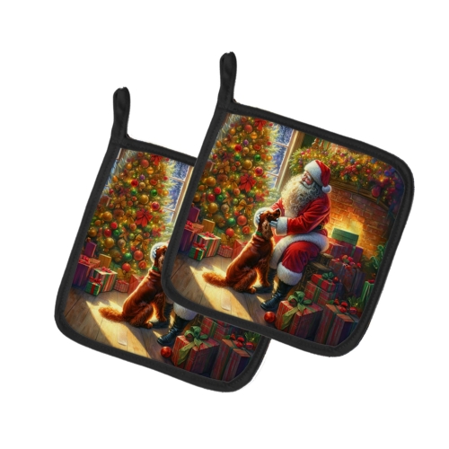 Pair of Pot Holders featuring breed specific Irish Setter artwork. Celebrate Christmas with this Christmas Pair of Pot Holders. A Pair of Pot Holders to match your kitchen decor. Made in the USA these are thick and functional. Full color artwork decorates the front polyester fabric of the hot pad and accented by a black trim. Use these at as a trivet for your Thanksgiving or Christmas tablescape. Filled with insulated fabric and quilted for durability. These colorful pot holders will make a great gift for your favorite home cook or executive chef. Each pot holder measures approximately 7 1/2 inches by 7 1/2 inches. A hanging tab is included.
