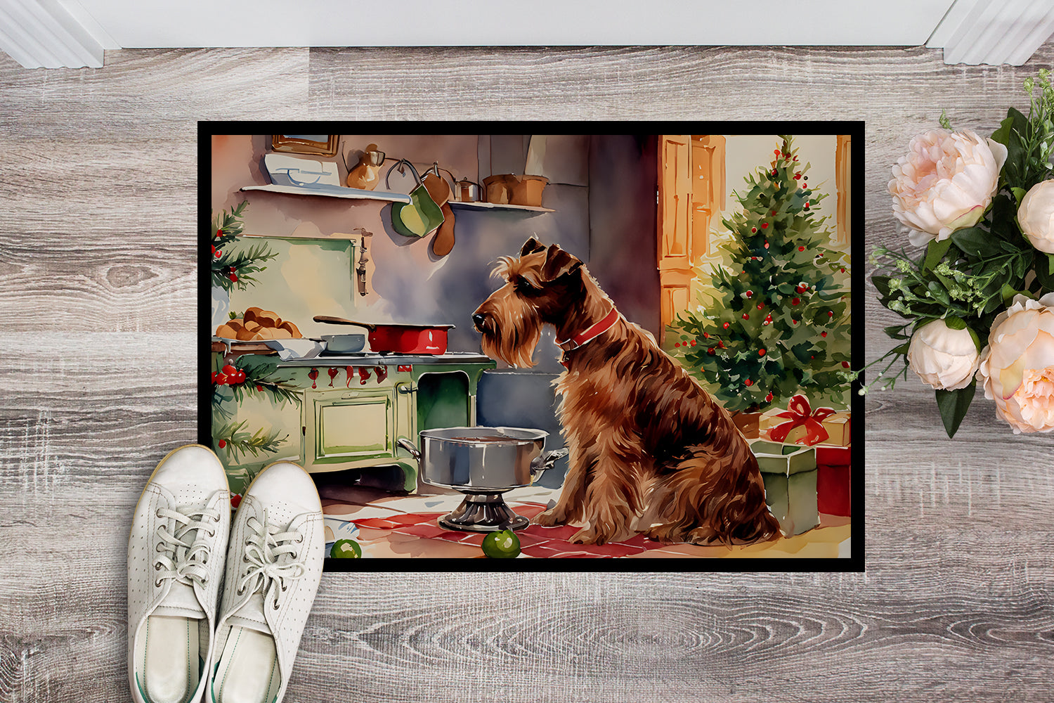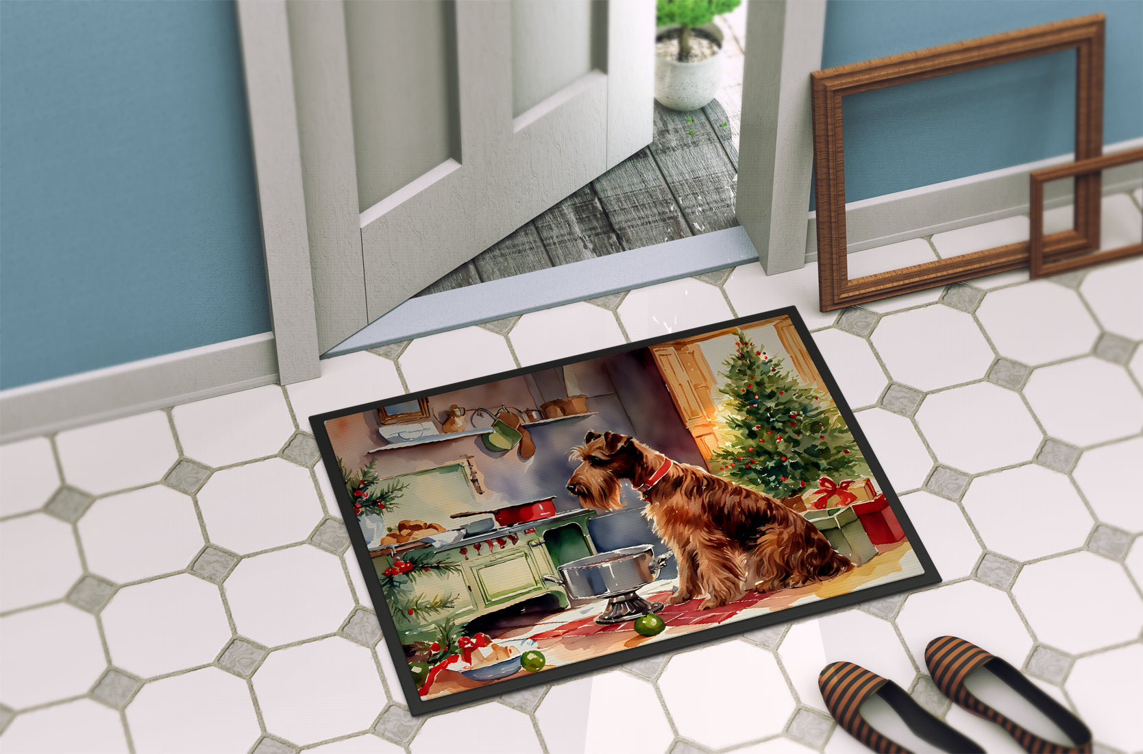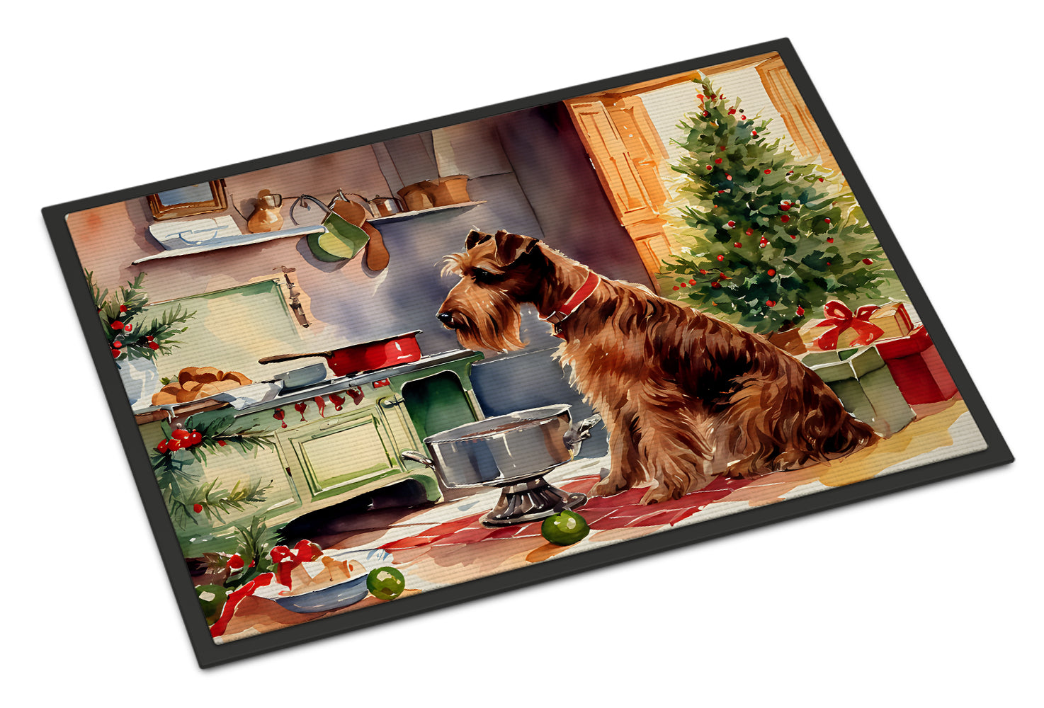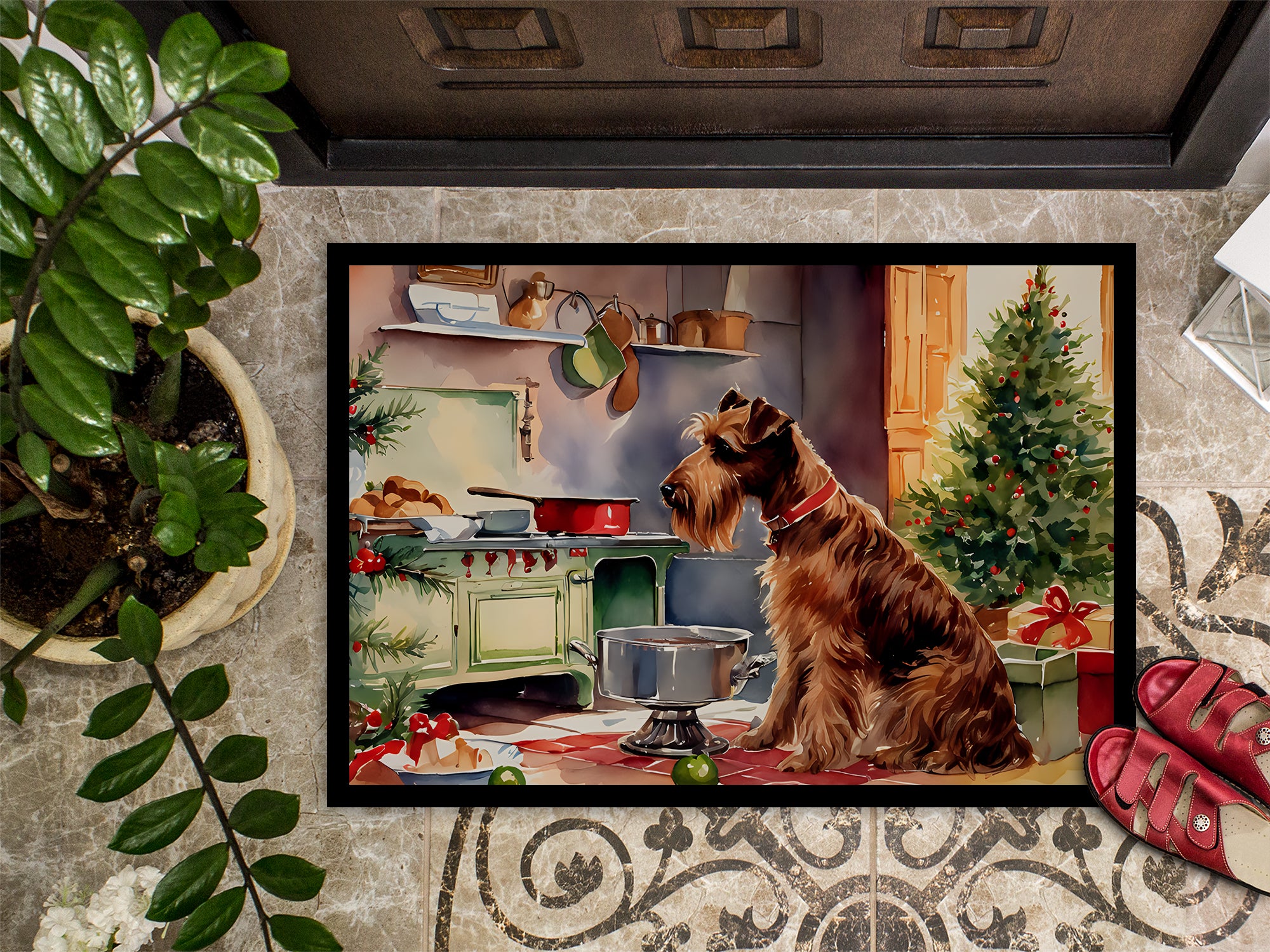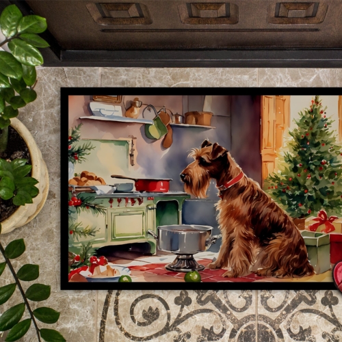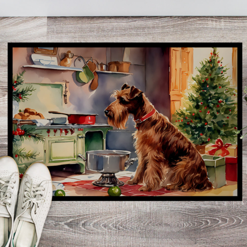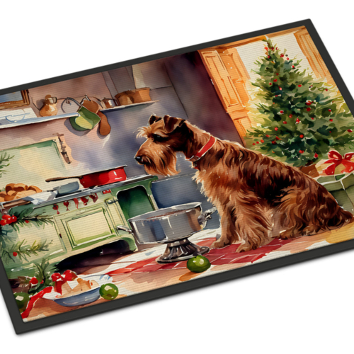 Doormat featuring breed specific Irish Terrier artwork. Celebrate Christmas with this Christmas Doormat. Welcome your guests in style with our Artwork Door Mat, designed to withstand almost any weather condition. This mat, measuring approximately 24 by 36 inches, is held together by durable black binding tape. Its top layer, composed of polyester felt, is dyed with the eye-catching image you see on the mat. A few layers below provide the mat with stability, while its rubber bottom is stamped to help prevent slipping and ensures safety. Our mat works wonderfully as both an indoor or outdoor door mat. For cleaning, simply hose it off with water or use a power washer – no need for any cleaner that produces suds. Avoid scrubbing with a brush, instead, opt for the vacuum on floor setting. Designed manufactured and printed in the USA, this mat is a perfect addition to your porch, outdoor kitchen, entryway, or any indoor space. Its unique design makes it a charming decorative rug that greets your guests and adds a stylish touch to your home decor.