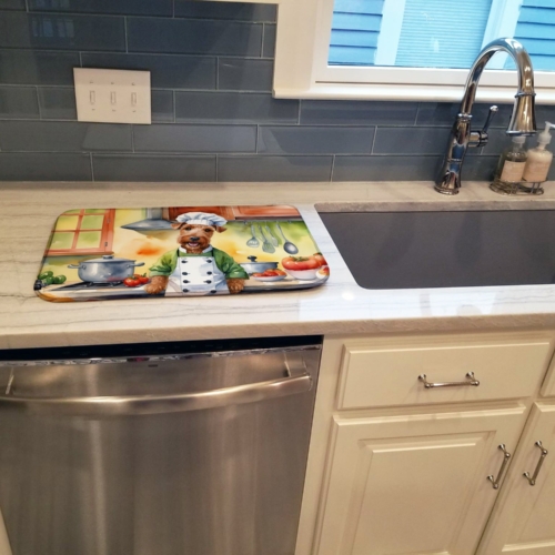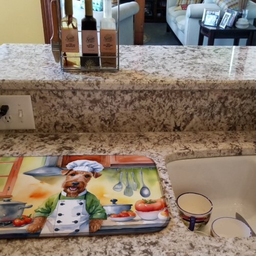 Dish Drying Mat featuring breed specific Irish Terrier artwork. Say goodbye to messy countertops and soggy dish towels with our innovative dish drying mat. Our high-quality dish drying pad is designed to keep your countertops dry while offering a stylish and efficient solution. Whether you’re air drying dishes, glasses, stemware, silverware, pots, pans, bottles, or even fruits and vegetables, our dish mat is the perfect choice. The 14 inches x 22 inches size fits most counters and dish drying racks, and the non-slip design ensures stability. Made with water-absorbent polyester and a polyurethane foam insert, our dish drying mat is not only functional but also durable. It’s machine washable and printed in the USA for long-lasting use. The beautiful artwork adds flair to your kitchen decor, making it a perfect housewarming gift or present for any occasion. Upgrade your kitchen experience with our absorbent and versatile dish drying mat.