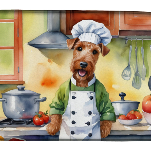 Dish Drying Mat featuring breed specific Irish Terrier artwork. Say goodbye to messy countertops and soggy dish towels with our innovative dish drying mat. Our high-quality dish drying pad is designed to keep your countertops dry while offering a stylish and efficient solution. Whether you’re air drying dishes, glasses, stemware, silverware, pots, pans, bottles, or even fruits and vegetables, our dish mat is the perfect choice. The 14 inches x 22 inches size fits most counters and dish drying racks, and the non-slip design ensures stability. Made with water-absorbent polyester and a polyurethane foam insert, our dish drying mat is not only functional but also durable. It’s machine washable and printed in the USA for long-lasting use. The beautiful artwork adds flair to your kitchen decor, making it a perfect housewarming gift or present for any occasion. Upgrade your kitchen experience with our absorbent and versatile dish drying mat.