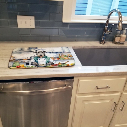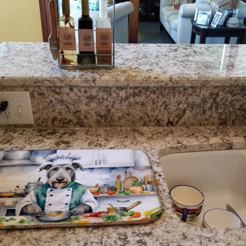 Dish Drying Mat featuring breed specific Irish Wolfhound artwork. Say goodbye to messy countertops and soggy dish towels with our innovative dish drying mat. Our high-quality dish drying pad is designed to keep your countertops dry while offering a stylish and efficient solution. Whether you’re air drying dishes, glasses, stemware, silverware, pots, pans, bottles, or even fruits and vegetables, our dish mat is the perfect choice. The 14 inches x 22 inches size fits most counters and dish drying racks, and the non-slip design ensures stability. Made with water-absorbent polyester and a polyurethane foam insert, our dish drying mat is not only functional but also durable. It’s machine washable and printed in the USA for long-lasting use. The beautiful artwork adds flair to your kitchen decor, making it a perfect housewarming gift or present for any occasion. Upgrade your kitchen experience with our absorbent and versatile dish drying mat.