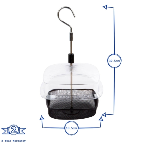 This hanging feeder is manufactured with an iron tray with polished steel hook & adjustable sturdy plastic transparent canopy. * – * – * Dimensions: 18.5cm Width: 18.5cm Depth: 18.5cm Height: 32.5cm * 2 Year Warranty – With a dedicated Customer Service Team committed to providing peace of mind from our door to yours. * Listing Contents – 1 Bird Feeder