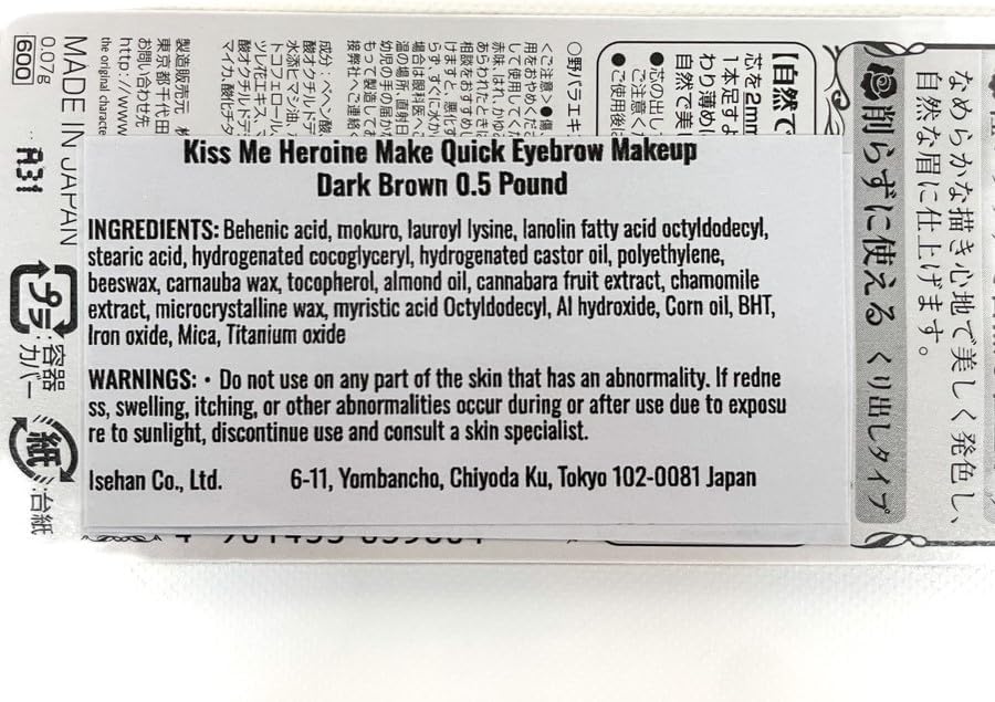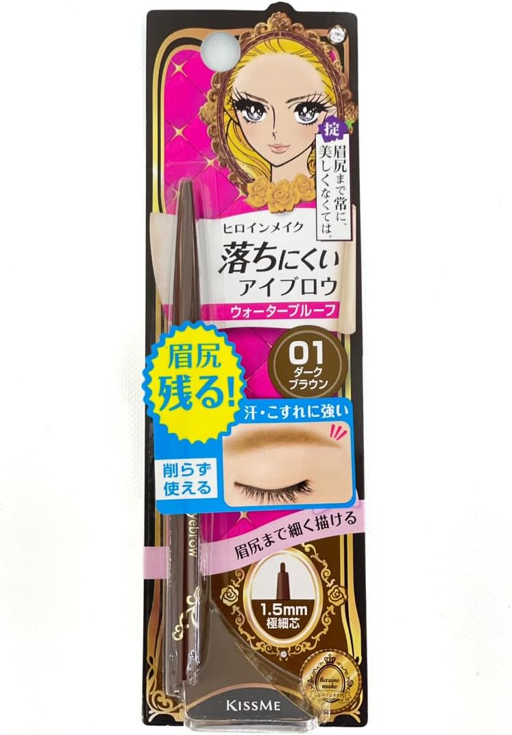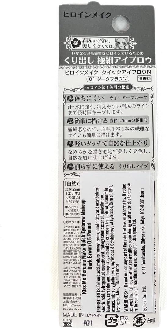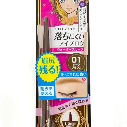 Keeps the perfect brow shape for all day. Super slim 1.5 mm tip to draw your ideal brow. Color last for long and resistant to water and sweat. With convenient rotatory pencil tip. How to use: Draw lightly from the inner edge of eyebrow to the eyebrow peak. In the same direction, draw stroke by stroke. Use the eyebrow brush to even the color.