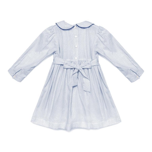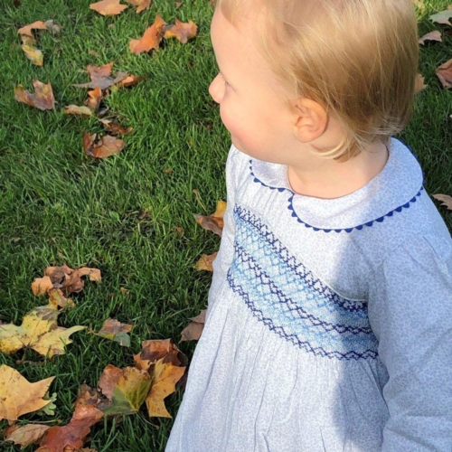 Smocked dress with delicate soft blue autumnal leaves on white background. A peter plan collar with a soft curved navy blue trim. Long sleeves with a button cuff and a tie belt with buttons at the back. Hand smocked with hearts in three tones of blue. 100% cotton and fully lined.