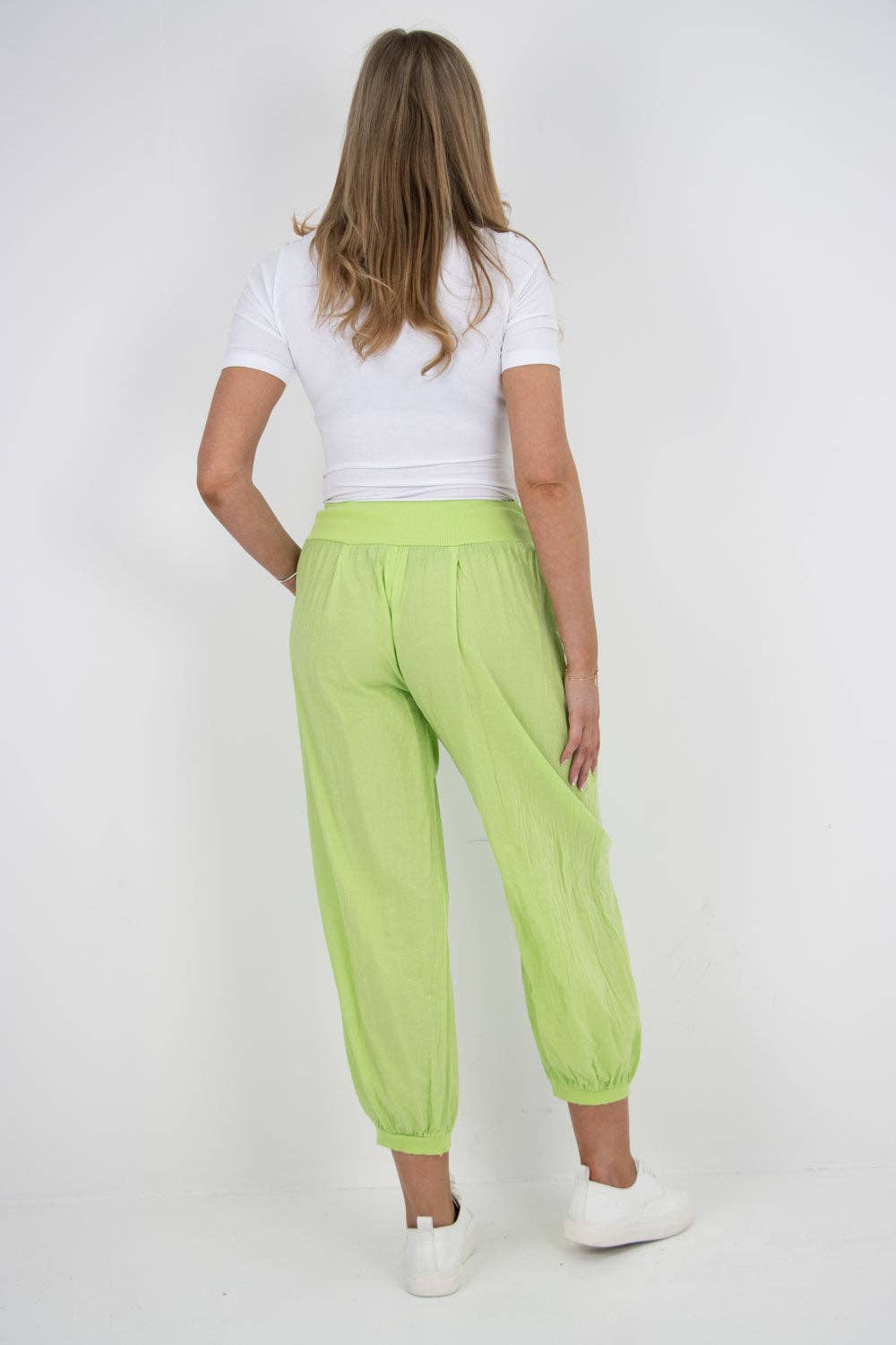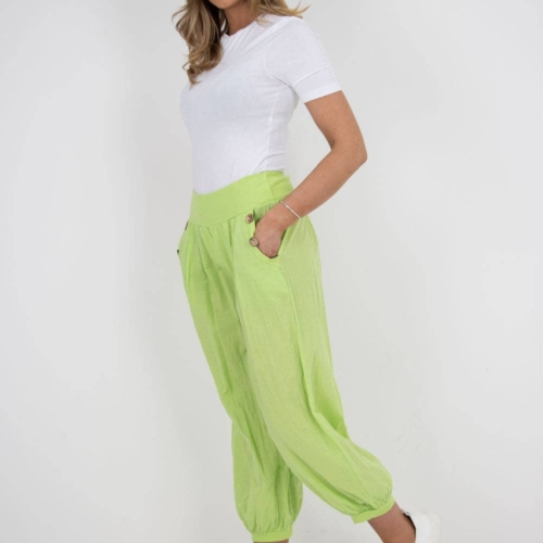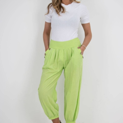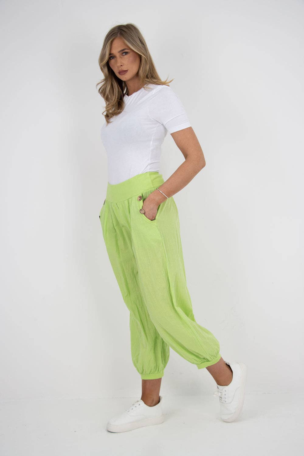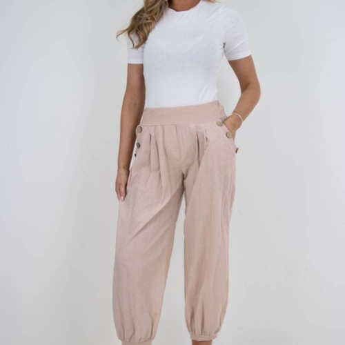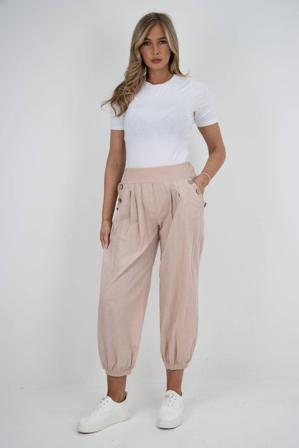 Upgrade your store’s lineup with the Italian Button Detail Trousers, a perfect mix of classic style and everyday ease. Made in Italy from soft, breathable fabric, these trousers feature side button detailing that adds subtle sophistication to a clean, flattering silhouette. Great for casual days, brunches, or staying chic at home. The elasticated waistband offers all-day comfort, while the tapered leg delivers a polished, modern look. These trendy women trousers are stitched with care to ensure lasting shape, durability, and effortless fit across body types. Side buttons add just the right amount of detail for dressing up or down. Pair them with simple tops, pretty tunics, or light jumpers for easy, stylish outfits. Offered in multiple sizes and shades, these trendy wholesale pants are a must-have in your trendy clothing collection easy to wear, easy to sell, and loved by women seeking both comfort and flair. Ladies Trousers Button Detail Pockets Very Comfy Fabric Made In Italy Fabric: 95% Cotton, 5% Elastane Size: Regular – One Size To Fit UK 8-14 Plus – One Size To Fit UK 16-20 Measurements: Waist: Regular – 28-42 Inches / Plus – 30-50 Inches Full Length: Regular – 37 Inches / Plus – 39 Inches
