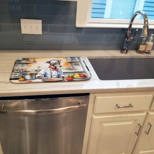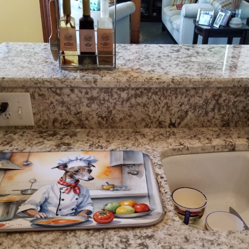 Dish Drying Mat featuring breed specific Italian Greyhound artwork. Say goodbye to messy countertops and soggy dish towels with our innovative dish drying mat. Our high-quality dish drying pad is designed to keep your countertops dry while offering a stylish and efficient solution. Whether you’re air drying dishes, glasses, stemware, silverware, pots, pans, bottles, or even fruits and vegetables, our dish mat is the perfect choice. The 14 inches x 22 inches size fits most counters and dish drying racks, and the non-slip design ensures stability. Made with water-absorbent polyester and a polyurethane foam insert, our dish drying mat is not only functional but also durable. It’s machine washable and printed in the USA for long-lasting use. The beautiful artwork adds flair to your kitchen decor, making it a perfect housewarming gift or present for any occasion. Upgrade your kitchen experience with our absorbent and versatile dish drying mat.