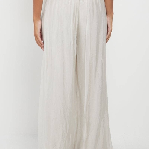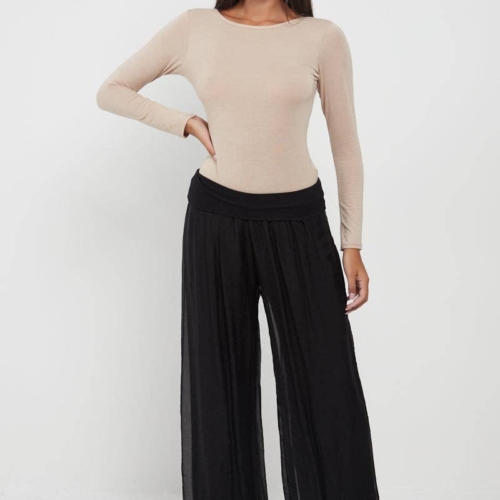 Bring a touch of effortless elegance to your store with the Italian Ladies Plain Wide Leg Silk Palazzo Trouser. Made in Italy using a soft silk-feel fabric, these trousers offer a smooth, luxurious texture and a beautifully flowing wide-leg silhouette. The elasticated waistband ensures a flexible, flattering fit that keeps your customers comfortable all day long. Perfect for everyday sophistication, these trendy women trousers are ideal for lunch dates, beach strolls, or simply lounging in style. Their clean, minimal design makes them easy to pair with tucked-in tops, trendy tunics, or lightweight sweaters. The neat stitching and high-quality finish add long-lasting value to every pair. A must-have for boutiques looking to stock trendy wholesale pants that blend comfort with elegance. These palazzos are a great choice for trendy clothing collections focused on resort wear, travel style, or everyday luxury. Style them easily or pair with our wholesale Italian silk, cotton, or linen tops and dresses for a complete look. Plain Palazzo Trouser Elasticated Waist Wide Legs Relaxed Fit Oversized Size: One Size (UK Fit 10-16) Fabric: Main: 100% Silk, Lining: 95% Viscose 5% Elastane Made In Italy Size Details: Length – 42 inches
