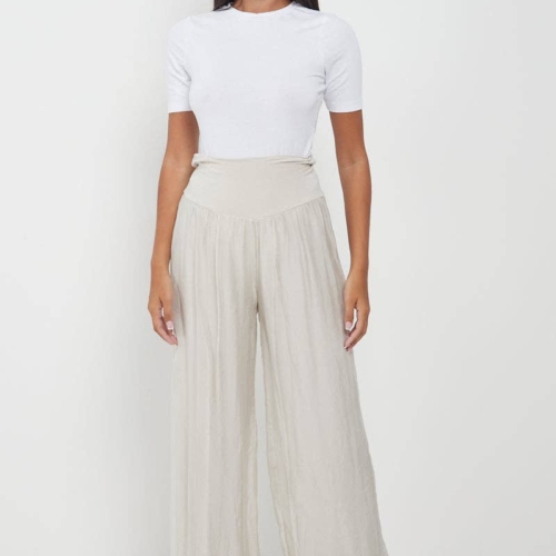 Bring a touch of effortless elegance to your store with the Italian Ladies Plain Wide Leg Silk Palazzo Trouser. Made in Italy using a soft silk-feel fabric, these trousers offer a smooth, luxurious texture and a beautifully flowing wide-leg silhouette. The elasticated waistband ensures a flexible, flattering fit that keeps your customers comfortable all day long. Perfect for everyday sophistication, these trendy women trousers are ideal for lunch dates, beach strolls, or simply lounging in style. Their clean, minimal design makes them easy to pair with tucked-in tops, trendy tunics, or lightweight sweaters. The neat stitching and high-quality finish add long-lasting value to every pair. A must-have for boutiques looking to stock trendy wholesale pants that blend comfort with elegance. These palazzos are a great choice for trendy clothing collections focused on resort wear, travel style, or everyday luxury. Style them easily or pair with our wholesale Italian silk, cotton, or linen tops and dresses for a complete look. Plain Palazzo Trouser Elasticated Waist Wide Legs Relaxed Fit Oversized Size: One Size (UK Fit 10-16) Fabric: Main: 100% Silk, Lining: 95% Viscose 5% Elastane Made In Italy Size Details: Length – 42 inches