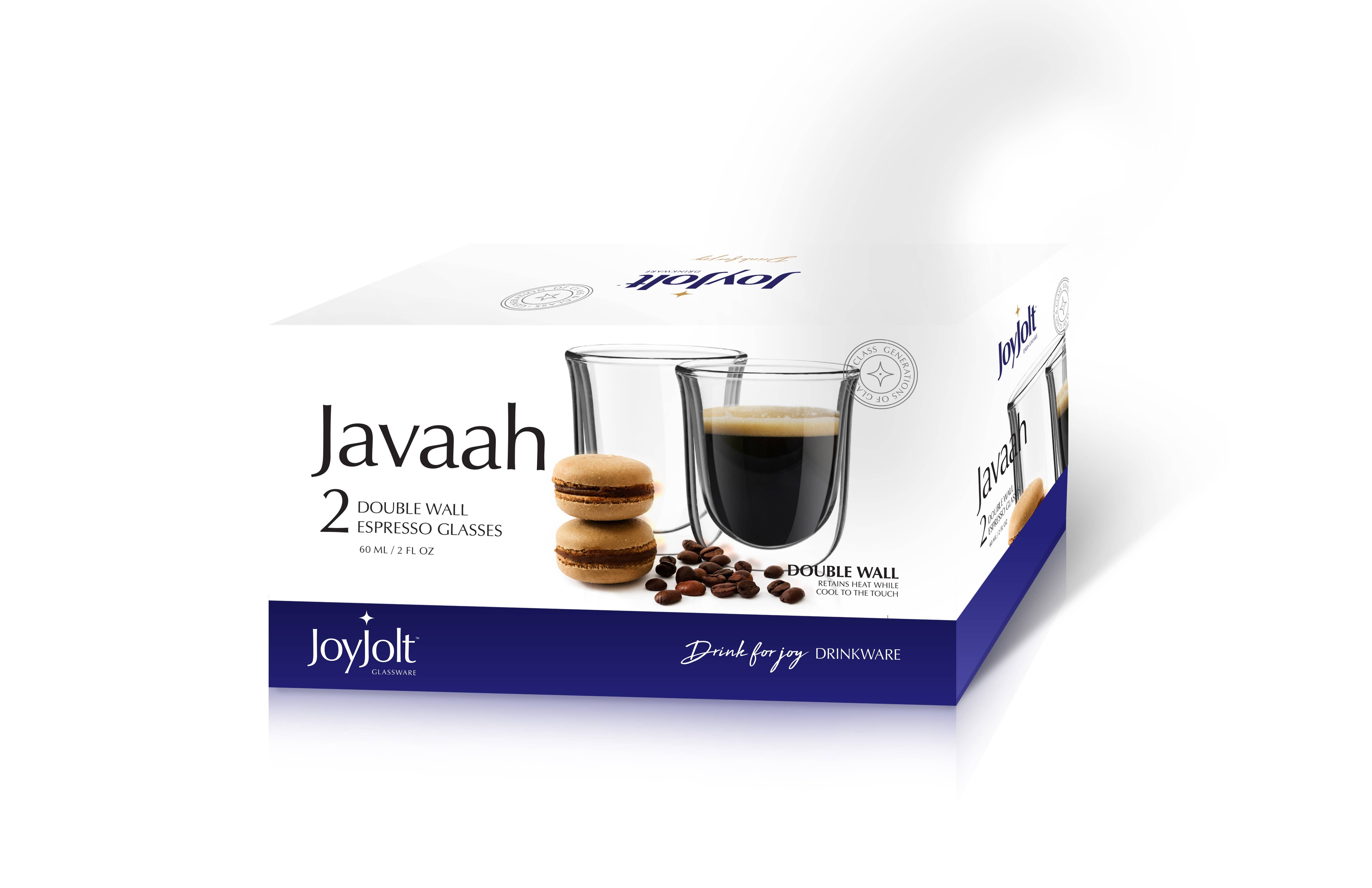 Enjoy your favorite drink with the unique Jaavah Espresso glasses! Made of mouth-blown borosilicate glass of the finest quality, the Jaavah features a double-walled design that suspends beverages within an inner wall for the ultimate insulation.