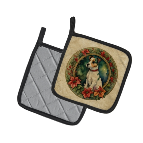 Pair of Pot Holders featuring breed specific Jack Russell Terrier artwork. Celebrate Christmas with this Christmas Pair of Pot Holders. A Pair of Pot Holders to match your kitchen decor. Made in the USA these are thick and functional. Full color artwork decorates the front polyester fabric of the hot pad and accented by a black trim. Use these at as a trivet for your Thanksgiving or Christmas tablescape. Filled with insulated fabric and quilted for durability. These colorful pot holders will make a great gift for your favorite home cook or executive chef. Each pot holder measures approximately 7 1/2 inches by 7 1/2 inches. A hanging tab is included.