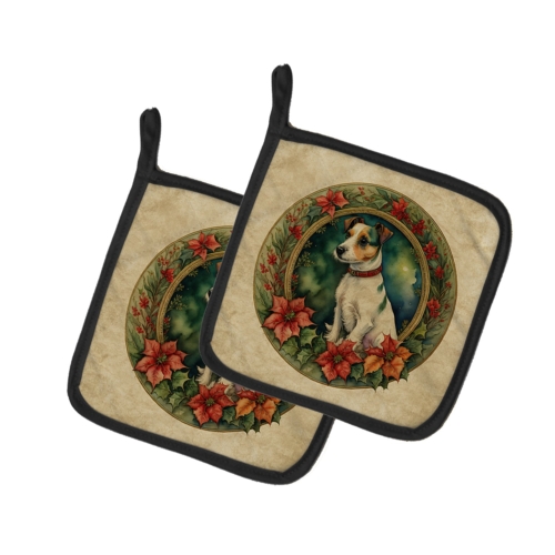 Pair of Pot Holders featuring breed specific Jack Russell Terrier artwork. Celebrate Christmas with this Christmas Pair of Pot Holders. A Pair of Pot Holders to match your kitchen decor. Made in the USA these are thick and functional. Full color artwork decorates the front polyester fabric of the hot pad and accented by a black trim. Use these at as a trivet for your Thanksgiving or Christmas tablescape. Filled with insulated fabric and quilted for durability. These colorful pot holders will make a great gift for your favorite home cook or executive chef. Each pot holder measures approximately 7 1/2 inches by 7 1/2 inches. A hanging tab is included.